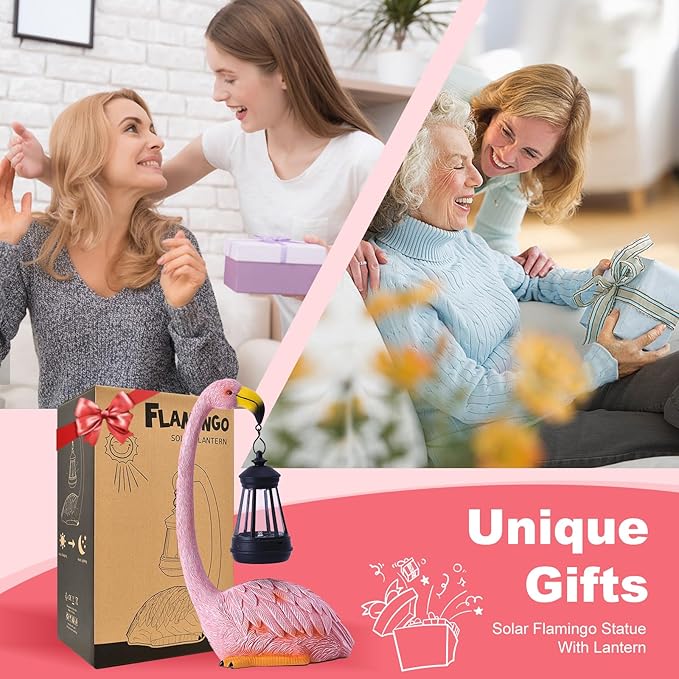 Garden Flamingo Statue with Solar Lantern - Outdoor Statue Yard Art for Patio Lawn Balcony, Unique Flamingo Gifts for Mom Women Grandma
