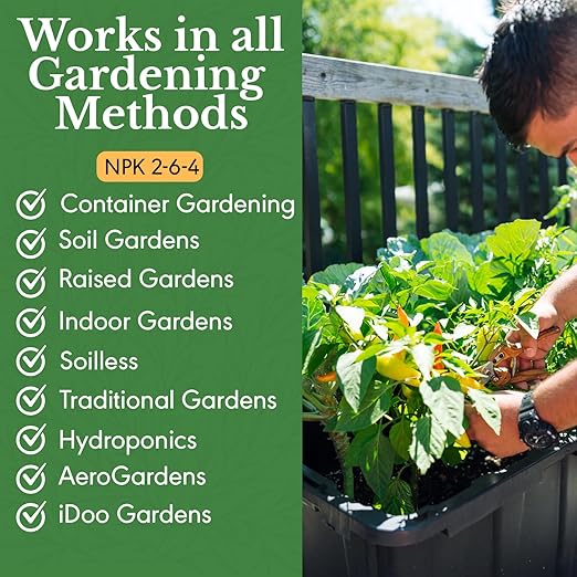 - 🌿 FORMULATED FOR VEGETABLE PLANTS WITH FRUIT & FLOWERS - With a innovative blend of horticultural grade nitrogen, potassium, phosphorus, micronutrients and sea kelp, this All Purpose plant food has an NPK of 2-6-4. Perfect for tomatoes and peppers. Reduce deficiencies and yellow leaves. Enjoy an exceptional growing experience and harvest with this single bottle liquid plant fertilizer solution.
