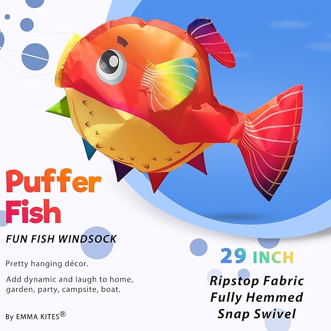- emma kites 29-inches Puffer Fish Windsock easily catches your eye in the distance with its bright colors and vivid waves. The vibrant colors to brighten up your backyard, and a cute ocean friend to your family and neighbors, and to rise good days!