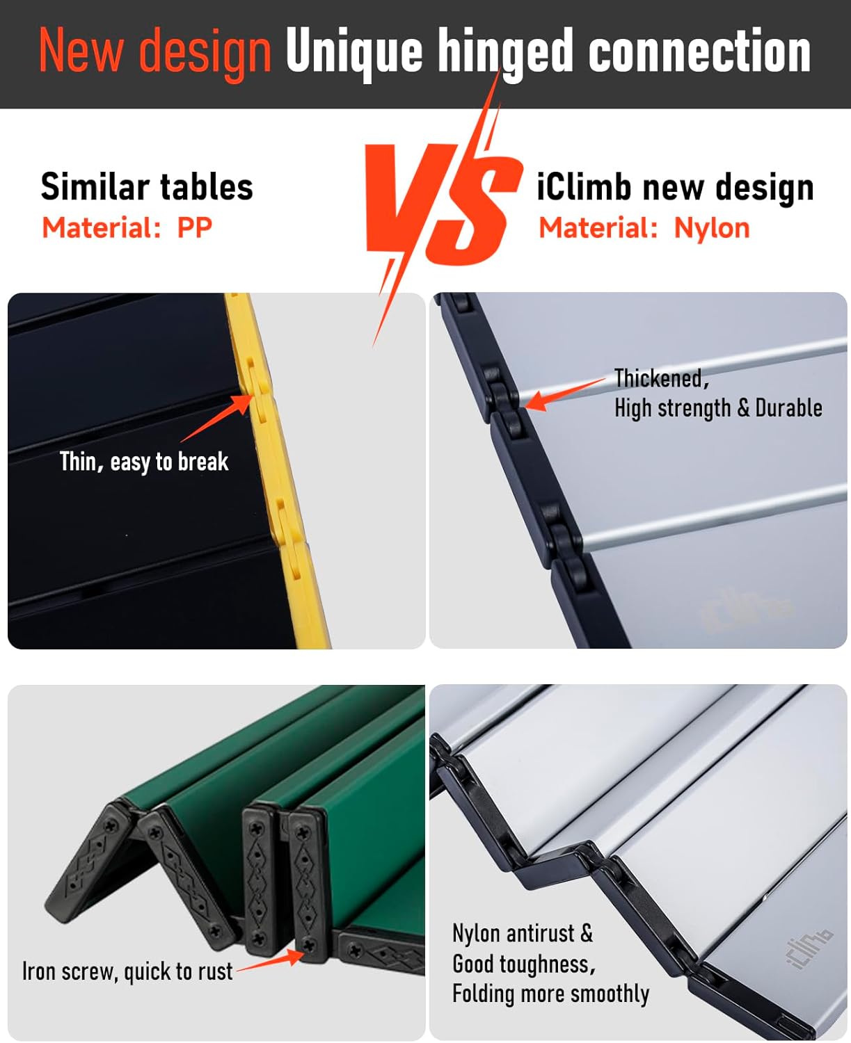 - Ultralight, made of aerospace-grade aluminum alloy, only 3.5 lbs; Max Load 88 lbs; Unlike wooden or nylon-top tables, this table is durable, waterproof, corrosion-resistant, easy to clean; Sturdy joints and anti-slip feet keep the table stable, with legs that won’t fold, bend, or slip on any terrain; Very easy to set up, just open the base frame and attach the tabletop, enjoy your leisure time in seconds, video guide available on this page.