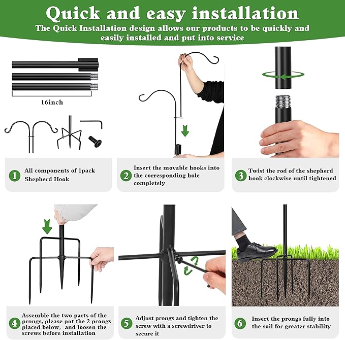 - Multi-Purpose Shepherds Hooks: These Shepherd hooks standers make any occasion enchanting whether decorating your patio, lawn, setting up a backyard barbecue, or arranging an unforgettable wedding. Retro shape and classic black look of the shepherds hook outside add beauty and elegance to your garden. Our shepherds hooks for outdoor hanging planters, flower pots, lanterns, garden lights, decorations, wind chimes, ornaments, flower balls, hummingbird feeder, succulents, solar light, moss baskets and more.
