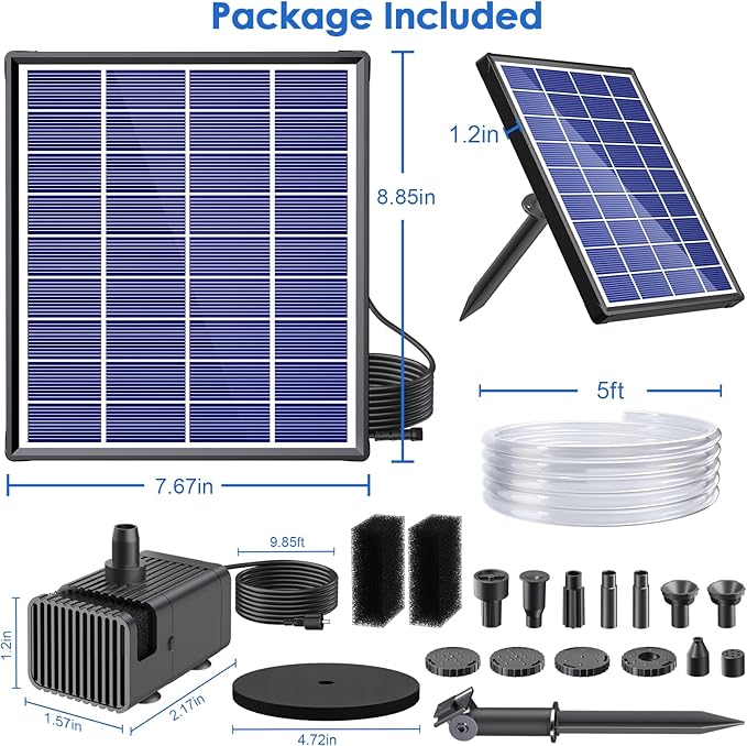 - ⛲【6.5W Solar Fountain Kit】No need batteries or electricity, our 6.5W solar fountain pump has upgraded high quality glass solar panel ensuring enough power for the work of the fountain and making the water spray more stable and long-lasting. It provides 20,000 hours of lifespan, and helps reduce environmental impact and saves energy.