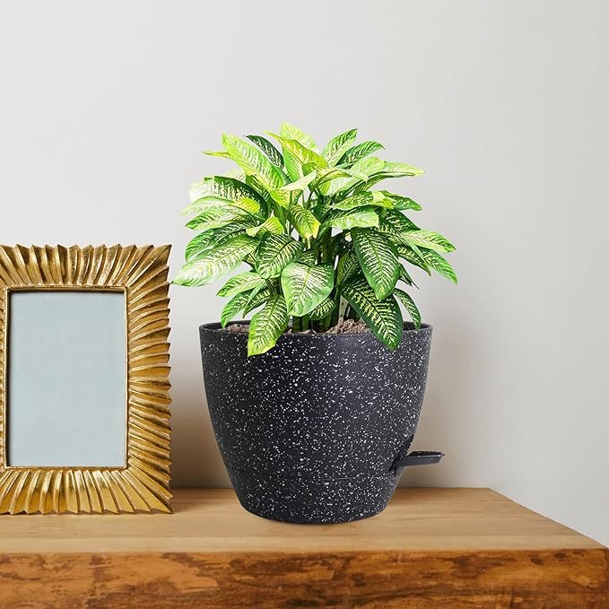 10 inch Self Watering Pots, Planter, Plant Pots with Mesh Drainage Holes for Indoor Outdoor House Plants and Garden, Pack of 2 Plastic Flower Pots with Deep Reservoir, Speckled Black