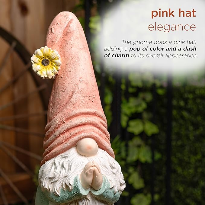 - CHARMING DESIGN: Peaceful gnome is captured wearing a lovely pink hat in a moment of prayer to bring a touch of serenity to your garden, radiating charm and positive energy