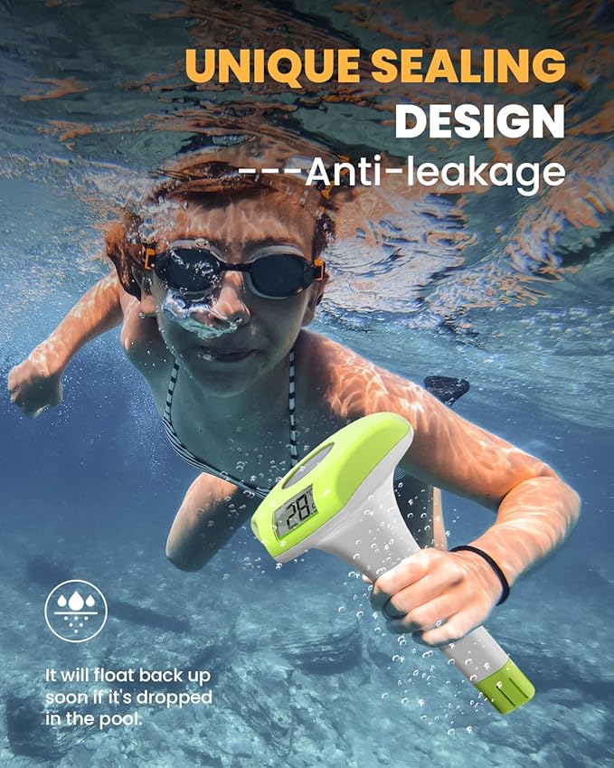 - 🍅UPGRADED IPX8 WATERPROOF: Our pool thermometer has been upgraded to IPX8 waterproof rating, specially crafted to stop rust, fogging, malfunction, and dirt buildup, keeping out water, snow, dust, and sand, thus maximizing the life of the pool thermometer.