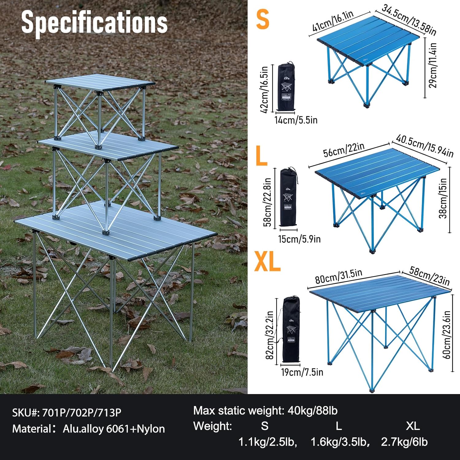 - Ultralight, made of aerospace-grade aluminum alloy, only 3.5 lbs; Max Load 88 lbs; Unlike wooden or nylon-top tables, this table is durable, waterproof, corrosion-resistant, easy to clean; Sturdy joints and anti-slip feet keep the table stable, with legs that won’t fold, bend, or slip on any terrain; Very easy to set up, just open the base frame and attach the tabletop, enjoy your leisure time in seconds, video guide available on this page.