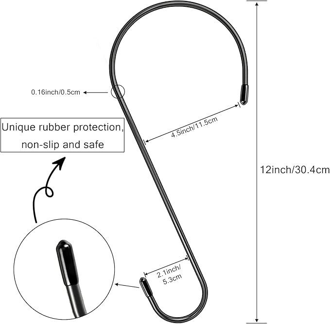 - Extra large size long s hook:Our extra large s hooks are up to 12 inches long, with a large opening of 4.5 inches wide and a small opening of 2 inches wide, and can be used as extension hooks for hanging plants, flower pots, and bird feeders. Please check the size before you buy to avoid a bad shopping experience for you.