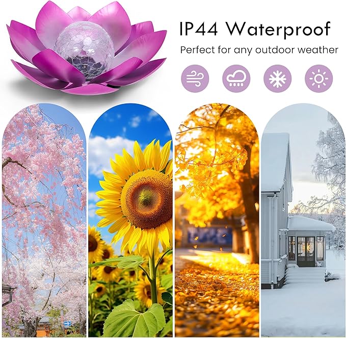 - 【Larger Capacity & Waterproof Lotus Solar Lights for Outside】: Our garden solar lights outdoor waterproof are solar powered, these lights can be completely placed in your outdoor area. Built-in high-quality 1.2 V Ni-MH AAA 600MAH battery. When the battery is fully charged in full sunlight, the decorative lights will be on for 6 to 8hours at night,The IPX4 waterproof rating ensures that outdoor solar lights can withstand all kinds of harsh climates.We've effectively addressed the issue of short lighting duration on cloudy days, ensuring that the light remains bright even during overcast weather.