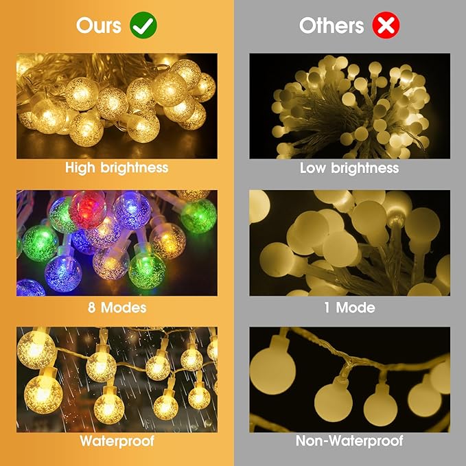 - Upgraded tring Lights:16.4 feet outdoor string lights With 50 Super Bright LED crystal globes. Each globe has a diameter of 17.5 mm, which is much larger than the others. What is the difference? Means you can get higher brightness and more gorgeous lighting effects. Unlike other black wire fairy light, this battery string lights use transparent tube to wrap string, making it consistent with the crystal ball style, which is not make people feel weird