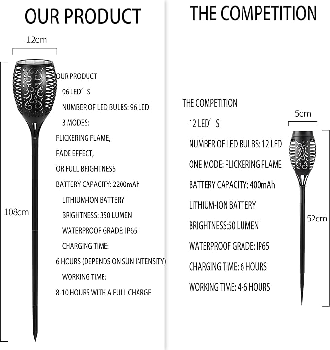- Gorgeous Dancing Flames: Our self-charging solar lamps charge by day and turn on automatically at night. They have 3 beautiful modes; Flickering Flames, Slow Fade from On/Off/On, or Full Brightness. They are gorgeous and attractive and look fantastic as decorative outdoor lighting. Whether lining pathways and driveways, placed in gardens, or just used during the holidays such as Halloween or Christmas, these light can do it all.