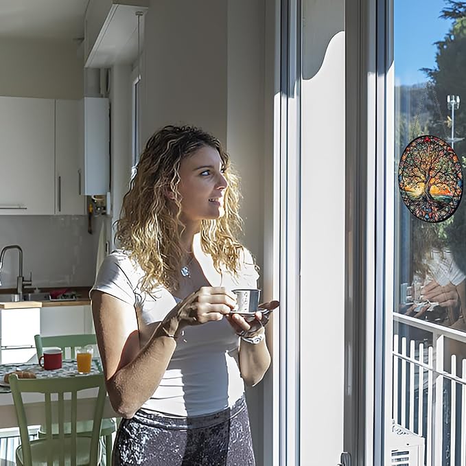 - 【stained Glass Window Hanging】This is a very beautiful Tree Of Life suncatcher with a size of 6x6 inches which is perfect for windows, adding a touch of color without obstructing the view outside. This piece of glass was cut individually and painted by hand. It is skillfully handmade, and it is real glass, NOT plastic or acrylic.