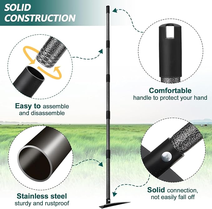 - Adjustable Handle Length: The weeding hoe's handle can adjust to 60" to accommodate gardeners of different heights. The ergonomic long handle can help protect your back and waist by reducing the need to bend. Length adjustment is quick and easy, just add or remove extension rods!