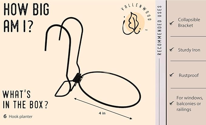 6 Pieces, 4 inches Iron hanging Flower Pot. Metal Plant Wall Hanger, Vertical Yard Garden. Planter Hook Ring, Rail Metal Fence. Indoor and Outdoor. Wire Trellis. Collapsible Bracket. (4 inches)