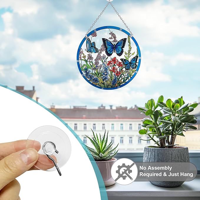 - 【Design Feature】This colored stained glass suncatcher is inspired by the beauty of nature, with an exquisite depiction of fluttering butterflies and blooming flowers in a vibrant palette. Butterflies symbolize transformation and rebirth, while flowers represent beauty and the flourishing of life, creating a harmonious and energetic addition to your space.