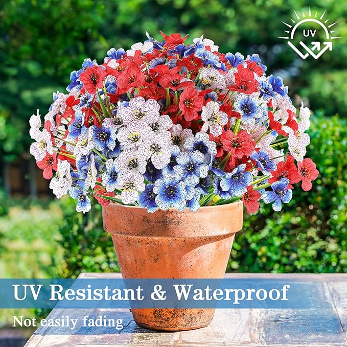 - Perfect for Outdoor/Indoor - Plastic flowers are ideal for outdoor porches,walkway,terraces windox box,front yard,pots,hanging planters,gardens,landscape,windowsills, allowing you to have beautiful colors all year around. Also, suit for Veterans Day /4th of July/American Independence Day/Memorial Day/American President Election Decoration