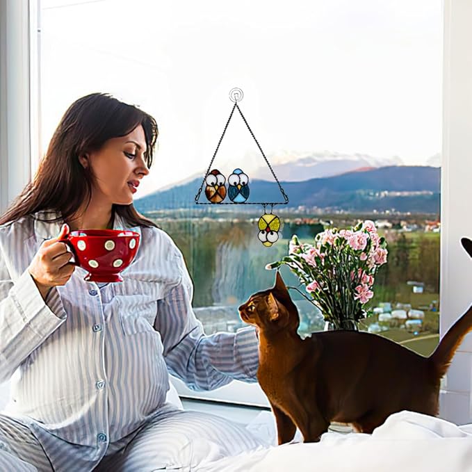 - OWL STAINED GLASS SUNCATCHERS: Stained Glass Bird Ornament is Made of Brown,Blue,Yellow Stained Glass Panel, Three Cute and Naughty Owls Will Make Your Life More Interesting. These Lovely Owls Bird Decor Stained Glass Window Hangings Could Been Transformed its Brightness and Allure When Illuminated By Natural Light that Add Happiness to Any Space in Your Home