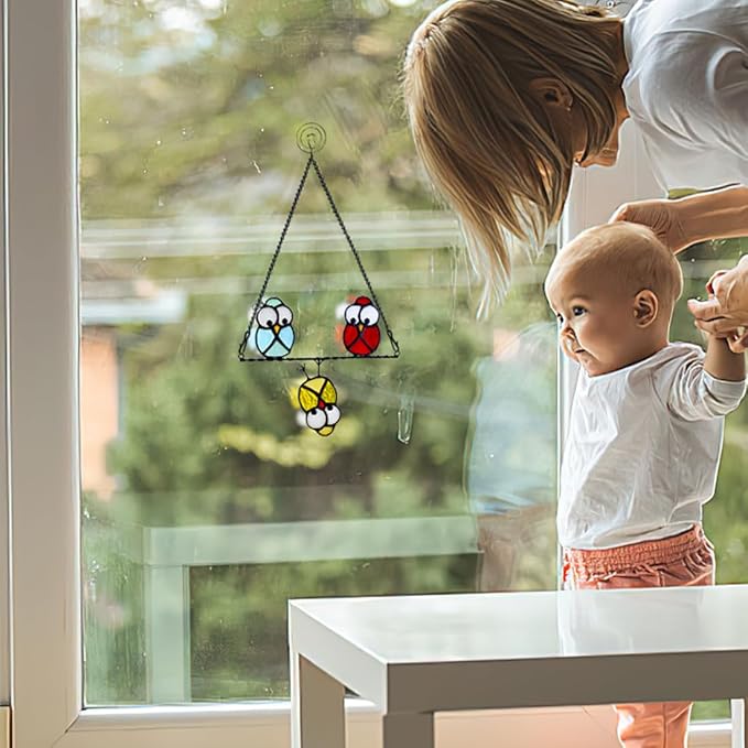 - OWL STAINED GLASS SUNCATCHERS: Stained Glass Suncatchers Bird Ornament is Made of Green,Red,Yellow Stained Glass Panel, Three Cute and Naughty Owls Will Make Your Life More Interesting and Funny. These Lovely Owls Bird Decor Stained Glass Window Hangings Could Been Transformed its Brightness and Allure When Illuminated By Natural Light that Add Happiness to Any Space in Your Home