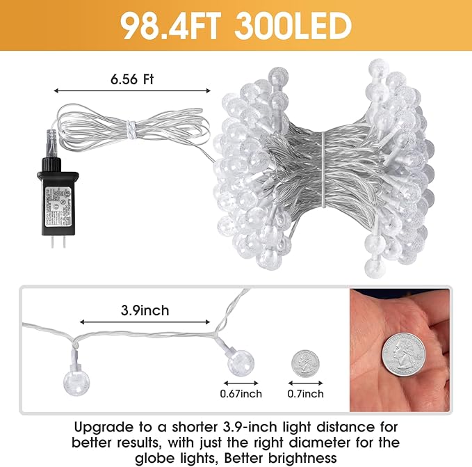 - Commercial quality string lights: The globe around the lights are shatterproof because they are made out of plastic. 300 led bulbs give off a warm white light. An ul listed power adapter comes with the lights,and the spacinga between bulbs is 3.94 inches
