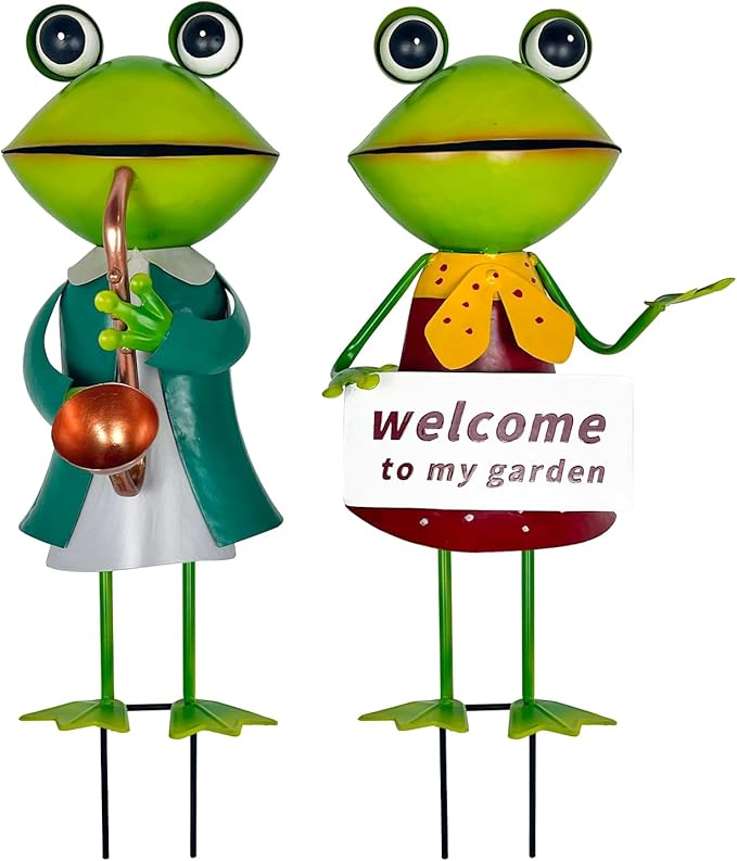 - 【Cute Frog Garden Decor】Featuring frogs wearing gorgeous costume, one holding a "Welcome" Garden Sign, and another playing the saxophone. Add bright colors to your favorite indoor&outdoor potted plants, create a whimsical vibe to your patio or front yard
