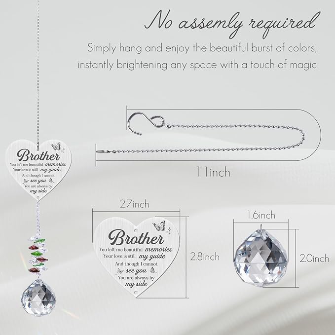 - Suncatchers for Windows Hanging: The memorial hanging crystal suncatcher can be hung anywhere. The perfect commemorative gift does not require any assembly, just peel off the transparent protective film on the stainless steel plate and you can use it.A small, thoughtful gift can speak volumes and show that you care and are thinking of someone who has lost a brother at a difficult time, as well as providing something tangible that can be kept and treasured forever.