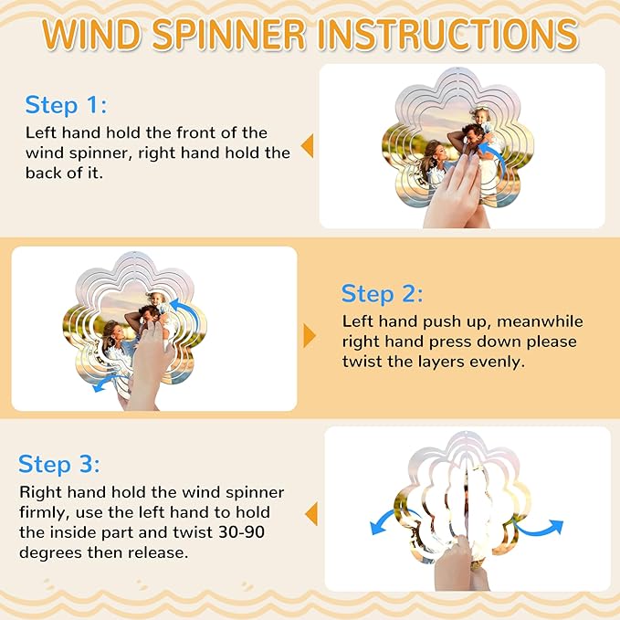 - EASY TO SUBLIMATE AND BEND — The windspinners yard decor is a flat and blank shape when you receive it. Just sublimate it at 365℉(185℃) for about 90-120s to make a gorgeous 3D sublimation wind spinner. Its special structure makes it easy to form vivid 3D sculpture shapes by hand. Then hang it up and it will drift freely in the breeze to form a captivating and magical 3D vision. When sunlight shines on the wind spinner, the high-gloss surface reflects a stunning light effect.