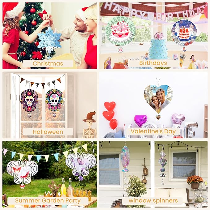 - BRIGHT AND VIVID COLOR: The double-sided of our wind spinner sublimation blanks ornaments is treated with high-quality sublimation coating, ensuring the vivid and crisp sublimation results for every project. Could be a nice Halloween decorations. Allowing you to incorporate your favorite designs or photos, unleashing your imagination to create a stunning personalized product. This windspinner sublimation blanks is suitable for heat transfer.