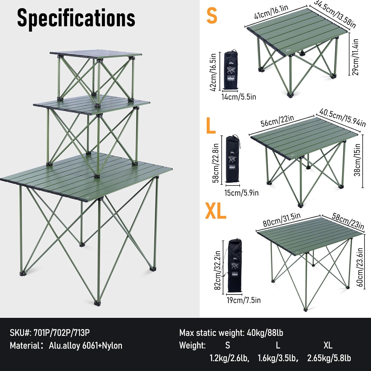- Lightweight, made of aerospace-grade aluminum alloy, only 5.8 lbs; Max Load 88 lbs; Unlike wooden or nylon-top tables, this table is durable, waterproof, corrosion-resistant, easy to clean; Sturdy joints and anti-slip feet keep the table stable, with legs that won’t fold, bend, or slip on any terrain; Very easy to set up, just open the base frame and attach the tabletop, enjoy your leisure time in seconds, video guide available on this page.