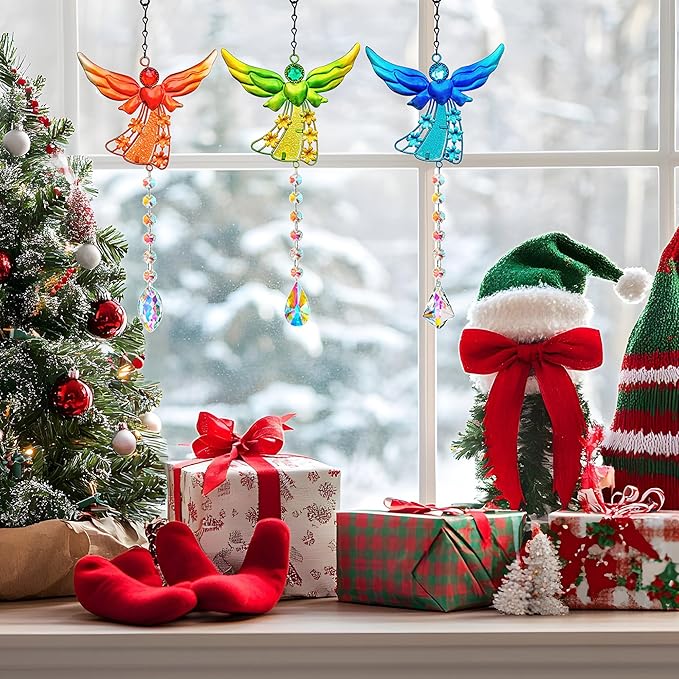 Set of 3 Guardian Angel Suncatchers, Crystal Angel Sun Catcher for Windows Hanging, Stained Glass Angel Ornament for Outdoor Christmas Decor