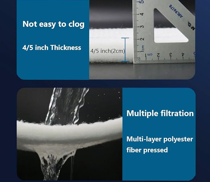 - 🐟Mechanical Filtration: Place the fine filter pads in flowing water to remove fish poop, uneaten feed, and other impurities particles to purify the water. Changing the pads regularly will improve the water quality and your pond will be crystal clear. Filter pad size: 118 inches (9.8 ft) by 8 inches by 3/5 to 4/5 inch Thickness.