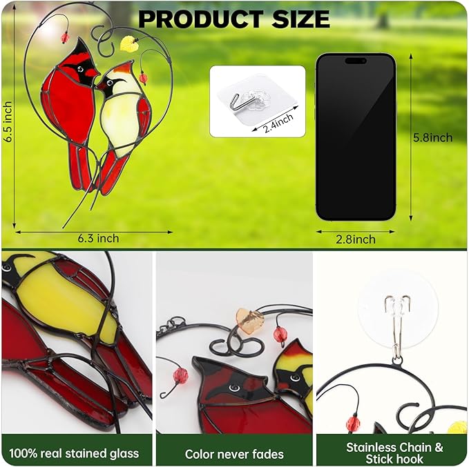 - 【Beautiful Decoration】Stained glass cardinal suncatcher colors are vibrant, the birds are cute and includes a clear back adhesive hook for hanging the piece, or you could just use any string, chain, etc. to hang the cardinal sun catcher anywhere you want to deco.