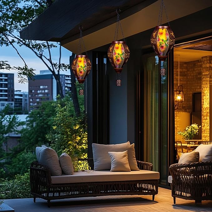 - 【Hot Air Balloon Solar Lantern】The solar lanterns outdoor waterproof is made of glass and metal, with hummingbird patterns on the glass and flower hollow patterns on the metal. The unique hot air balloon design coupled with flickering flame light makes this outdoor lantern rise like a hot air balloon as night falls, creating a warm and beautiful atmosphere for your garden