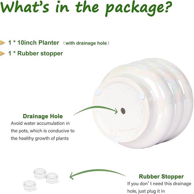 10 inch Ceramic Plant Pots for Indoor Plants, Rainbow Pearl Glaze Planter with Planters for Plants with Drainage Hole, Orchid Pots, Succulent Pot, Large Flower Pot (White)