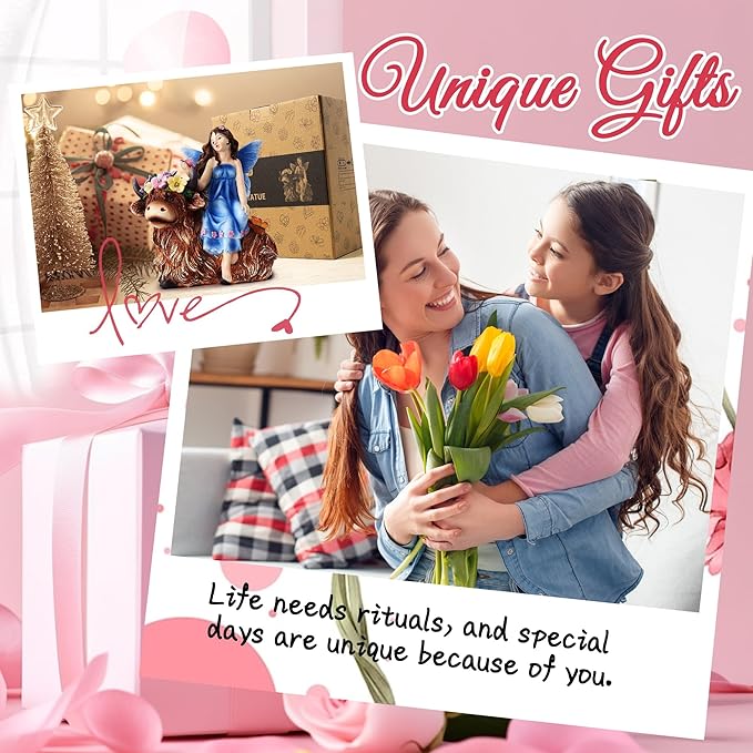 - 【Design and Aesthetics】The length, width and height of this statue are 7.2 x 7.8 x 4.3 inches.This enchanting statue features a beautiful fairy sitting atop a friendly Highland cow adorned with a lovely flower crown. The fairy gently holds a butterfly in her hand, adding a fairy-tale charm to your garden, yard, or patio.