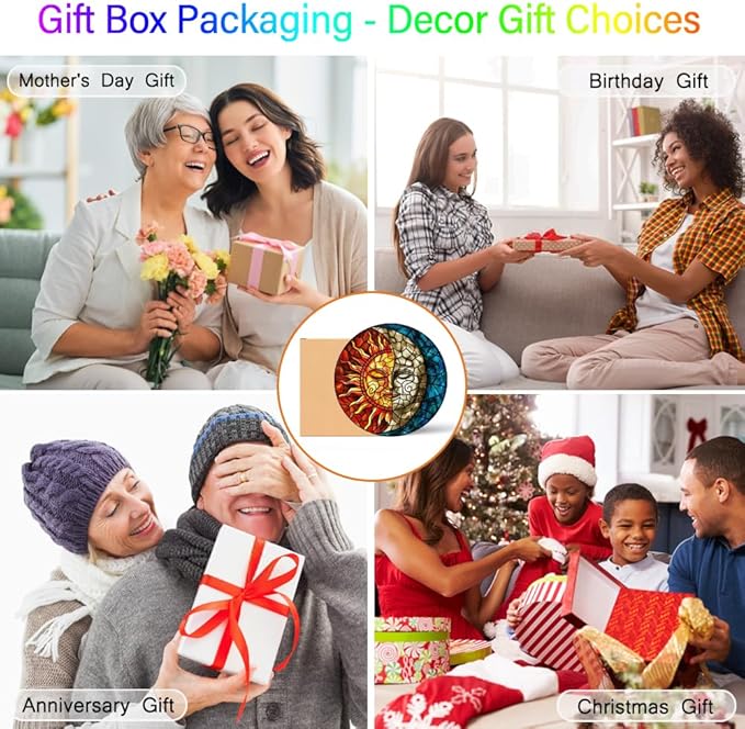 - 【Exquisite Festival Gift Memorial】The handmade suncatcher for hanging stained glass is a lovely gift for your mother, daughter, friends, family, lover or nature enthusiast, can be decor glass doors, kitchen windows, upstairs windows, round top windows, front windows, bedroom windows, kitchen doors, our sun and moon room decor panel would be a great embellishment to your home. Suitable for Mother's Day gifts, Christmas gifts, Thanksgiving Day gifts, Birthday gifts, Friendsgiving gifts.