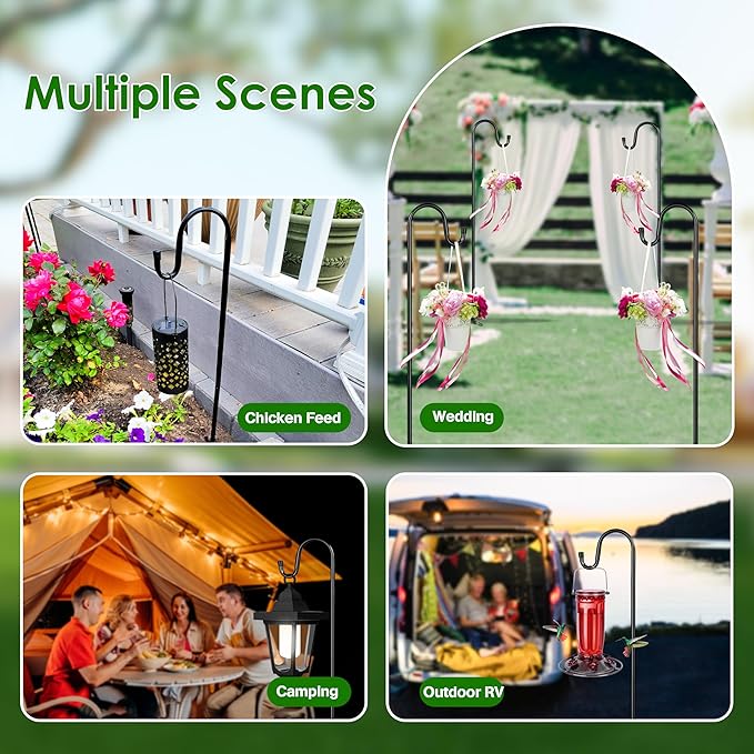 - Effortless Setup and Installation:Setting up your Shepherd's Hooks is a breeze. Simply stake them into the ground, and they are ready to hold your favorite garden decorations, bird feeders, or lighting fixtures, allowing you to transform your space in minutes.