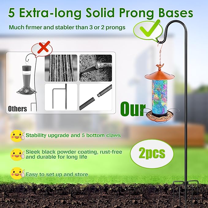 XDW-GIFTS Bird Feeder Pole for Outdoor, 2-Pack 60 Inch Shepherds Hooks Heavy Duty Garden Pole for Hanging Plant Basket, Solar Light Lanterns, Garden Plant Hanger Stands with 5 Base Prongs