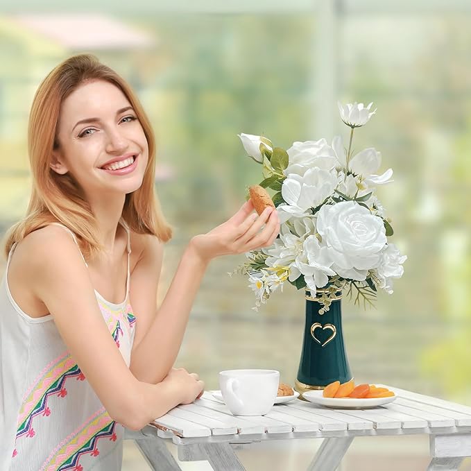 - 3. FULLY STYLE: This artificial flower arrangement features a stunning white rose bouquet paired with an abstract heart-shaped ceramic vase, creating an affordable luxury art piece.