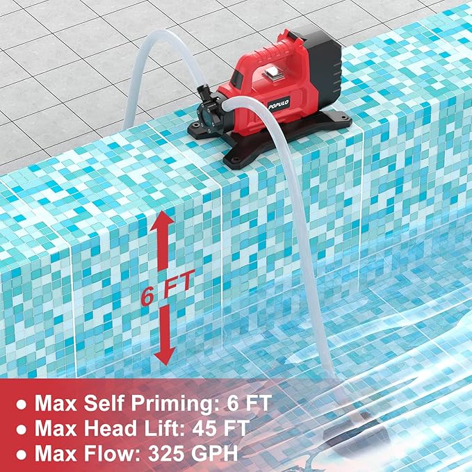 - Upgraded Version: POPULO AC/DC hybrid water transfer pump is upgraded with a durable impeller and a reinforced motor. It can run off a Populo 20V Lithium battery pack or 120VAC electric power, The water suction pump has a suction lift up to 6 ft, Max flow 325 GPH, and 45 ft Max head lift, which can meet most of the daily uses. Multiple powering options, you can plug the pump into a wall outlet or portable power station, or run directly on battery power. Pumps over 150 gallons on a single charge of a 4.0 Ah battery included