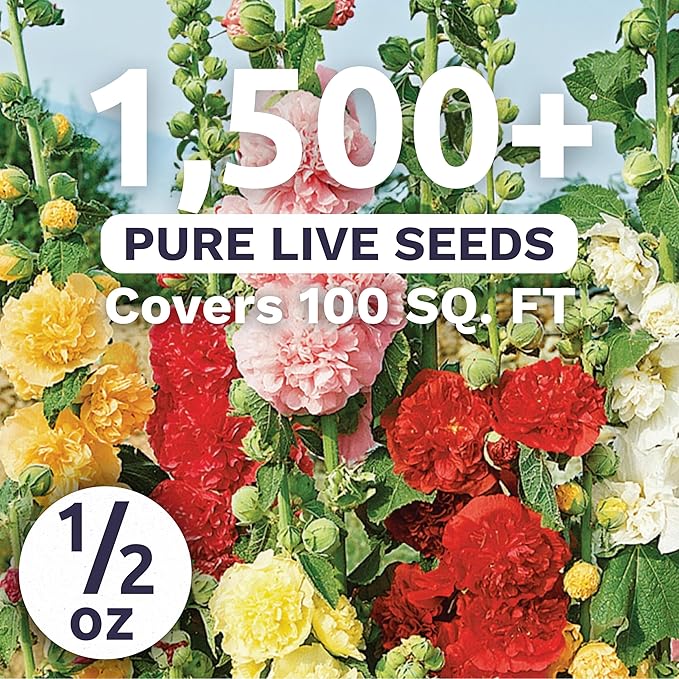 - HOLLYHOCK 'CHATER'S DOUBLE' MIX: Bring old-fashioned charm to your garden with Hollyhock 'Chater's Double Mix'! These towering plants produce large, double blooms in a range of colors, from deep reds to soft pinks and bright yellows. Perfect for creating a cottage garden vibe, they add vertical beauty to any landscape. Ideal for growing along fences or walls, these blooms will make a bold statement and provide lasting color throughout the summer.