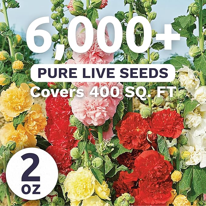 - HOLLYHOCK 'CHATER'S DOUBLE' MIX: Bring old-fashioned charm to your garden with Hollyhock 'Chater's Double Mix'! These towering plants produce large, double blooms in a range of colors, from deep reds to soft pinks and bright yellows. Perfect for creating a cottage garden vibe, they add vertical beauty to any landscape. Ideal for growing along fences or walls, these blooms will make a bold statement and provide lasting color throughout the summer.