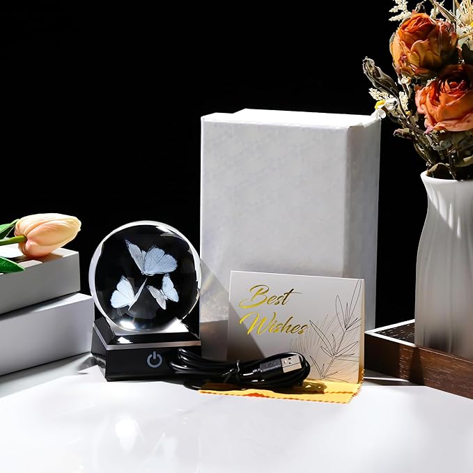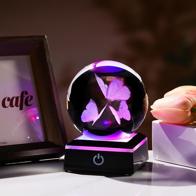 Qianwei Butterfly Gifts for Women 3D Crystal Ball 3.14'' - 80mm Laser Decor Glass Animals Figurines Statue for Room Decorations Night Light