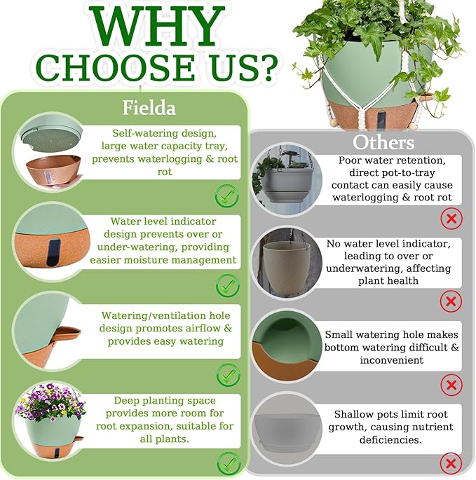• 【Water Level Indicator Design】Unlike other hanging planters, Fielda hanging plant pot features an innovative design with a specially crafted visible window in the bottom tray, allowing you to monitor the water level at any time. This way, you can prevent plant damage from underwatering or overwatering with ease.
