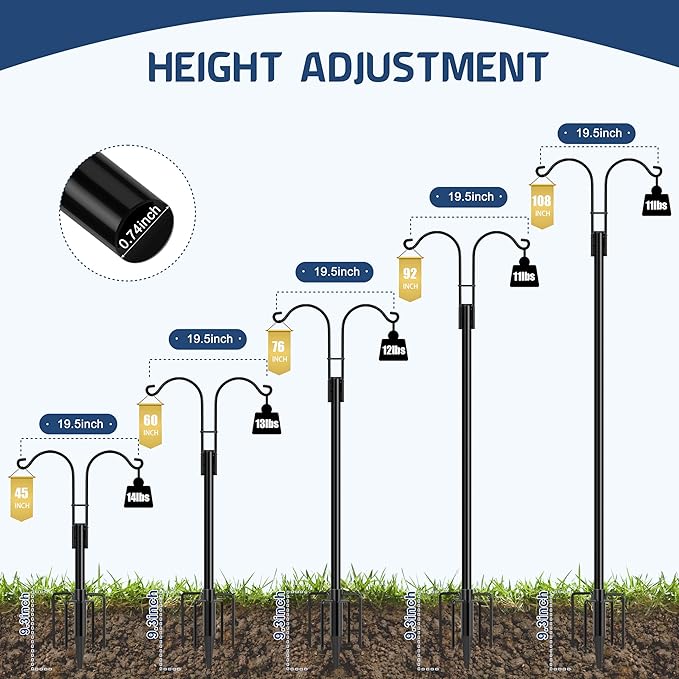 - Versatile & Multi-Purpose: Built with a sturdy frame and double-arm design, our outdoor shepherd's hook is ideal for hanging solar lanterns, flower baskets, plant pots, hummingbird feeders, wind chimes, and more. As shepherds hooks for outdoor, it adds charm and functionality to any outdoor space, making it the perfect accessory for gardens, patios, or backyards.