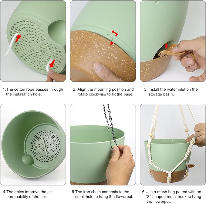 - 【Self-Watering Hanging Planter with Removable Tray】This hanging flower pot comes with a detachable bottom tray that acts as a water reservoir, holding a good amount of water. When your plant needs water, it’s absorbed through cotton wicks from the reservoir to the soil, reducing how often you need to water