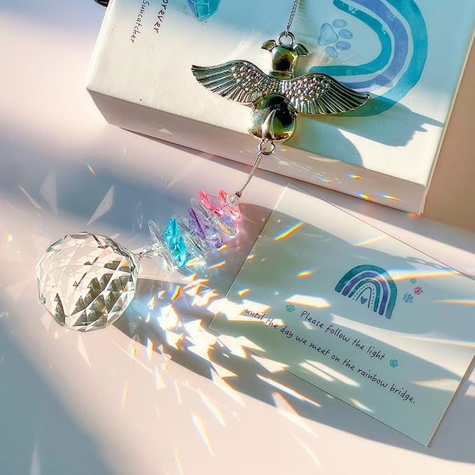 - Hanging Rainbow Maker: Hang this pet memorial crystal rainbow catcher by a window, on a balcony, in the yard, in the garden, or in the bedroom. As light passes through the crystal prism, enchanting rainbow colors fill the entire space, instantly evoking memories of your beloved dog and warming every corner of your heart.