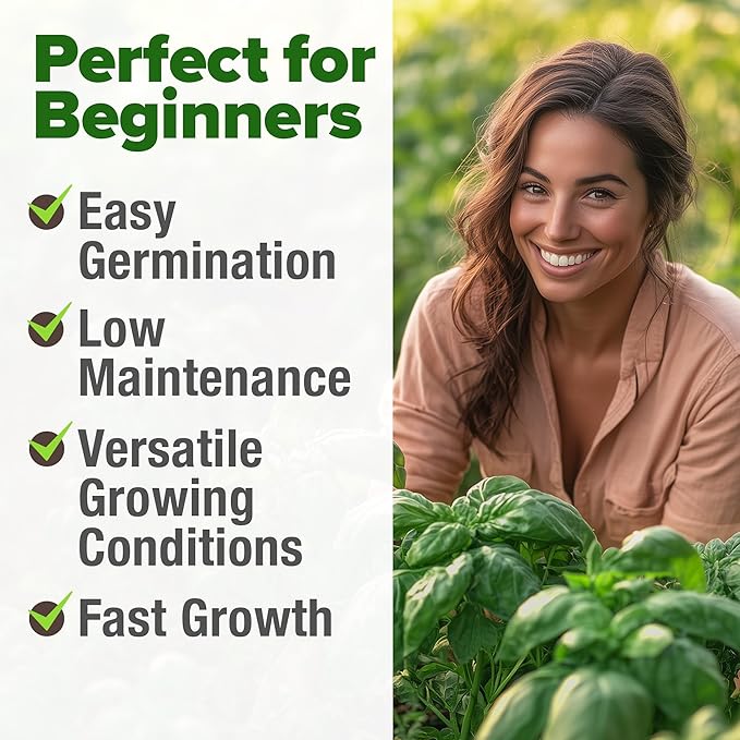 - LOW MAINTENANCE AND HIGH YIELDS – Sweet Italian Large Leaf basil is a hardy, resilient basil plant that requires minimal care once established. With regular watering and proper sunlight, these herb seeds grow up to 24 inches tall, producing large, flavorful leaves with each harvest. Perfect for those looking to grow basil seeds for planting indoors or outdoors with minimal upkeep, this basil delivers fresh herbs without the hassle of constant gardening.