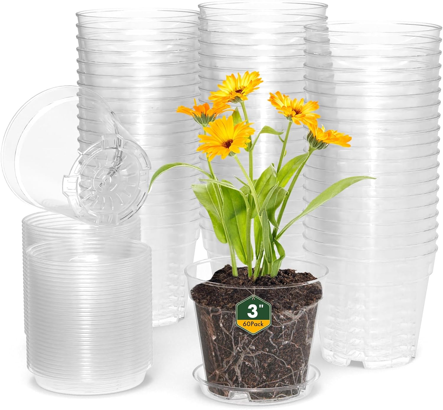 3 Inch Clear Nursery Pots, 60 Pack Highly Transparent Plastic Seedling Starter Planters with Drainage Holes and Trays for Flowers, Small Plant Pots for Indoor Plants