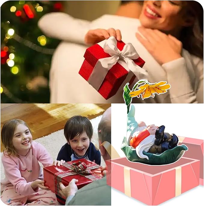 - 【Charming Design】: This whimsical resin gnome lies on a large green leaf, wearing a light-green hat and using a big yellow stamen as a sunshade. Its decorative, funny face and artistic details add a heartwarming touch to any garden or flower bed.
