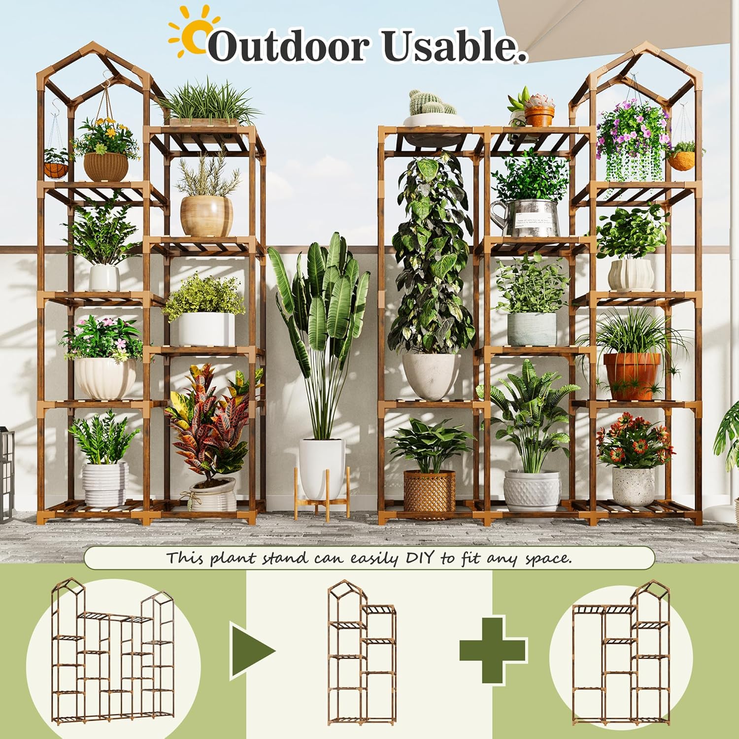 - 【Durable Carbonized Natural Wood and DIY Plant Shelves】The plant racks are made of premium wood and carbonized at high temperature, no fade, shrink, warp. This process not only extends its lifespan but also ensures it remains a healthy choice, eliminating the need for extra paint or varnish, that enhances waterproof performance and extend service life for both indoor and outdoor use. You can customize the configuration, DIY to suit your preferences! Easily switch up the overall shape of the plant stand by simply changing the connections around. You can also split or connect multiple kits together to make displays that fit your space and create your indoor garden