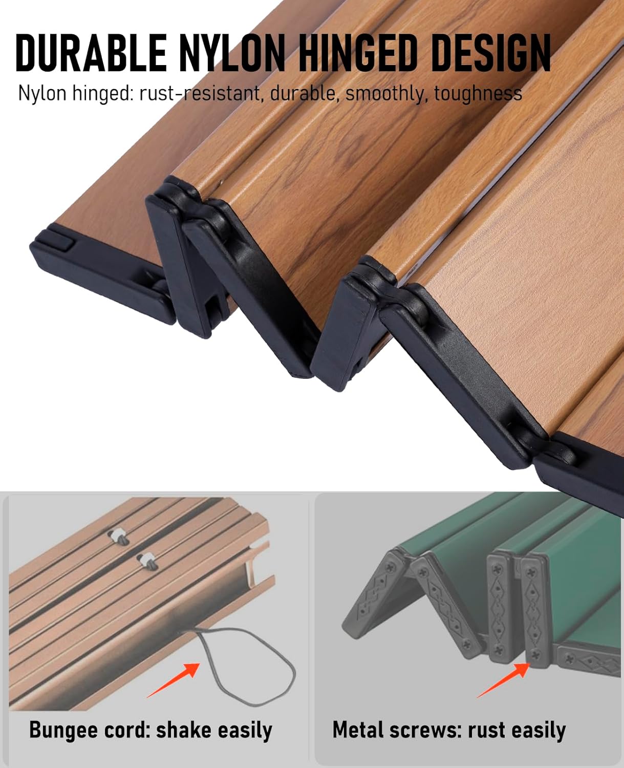 - Durable Nylon Hinged Design – Unlike other similar tables that use metal screws that rust easily or bungee cords that shake easily, WildCall camp table uses nylon hinges to connect each panel of the table, which is not only rust-resistant and durable, but also makes the table fold more smoothly and tough